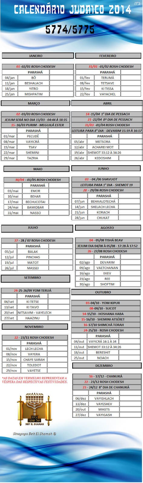 Calendário do ano de 2014 (5774/5775) - horários para o Rio de Janeiro (Para horários de outras cidades ou países, é só procurar o nome de sua cidade no aplicativo ao lado direito da página do Blog - não se esqueça de selecionar a opção "Horário de Verão" se sua cidade participa do horário de verão).